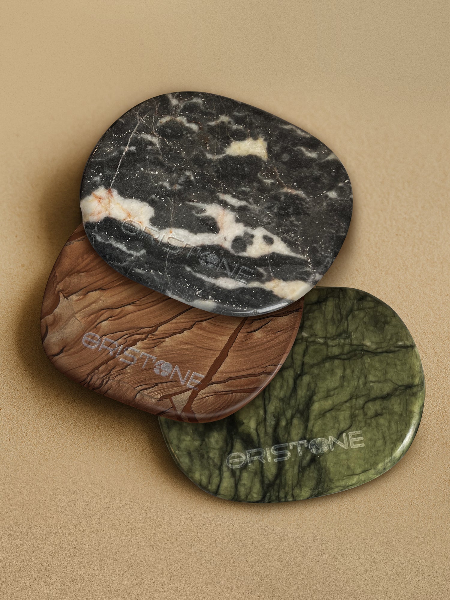 Our pieces are crafted from stone materials originally sourced from nature. Each one is cut from larger raw stone blocks, shaped and finished by hand to highlight its organic texture and energy.