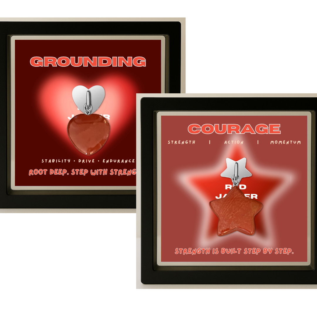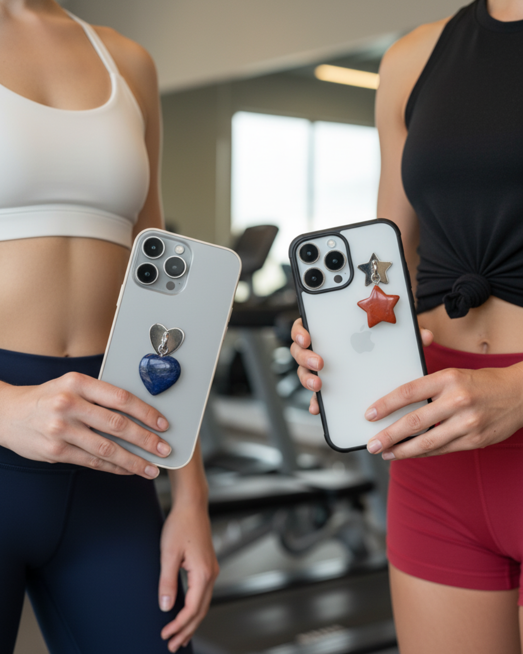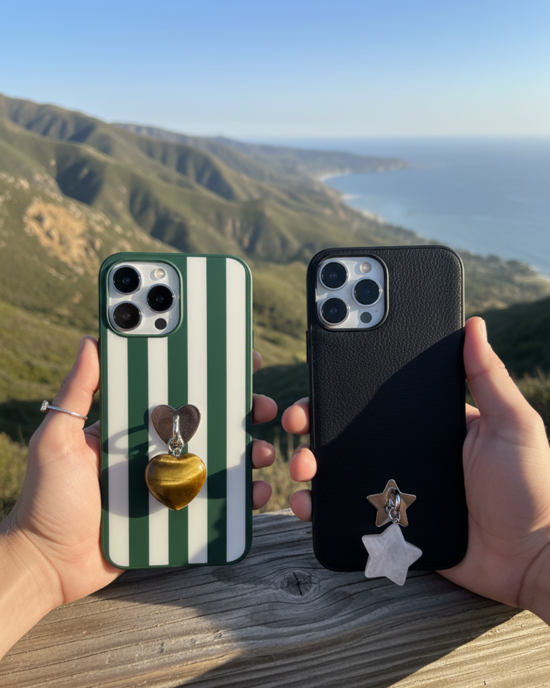 Two gemstone phone charms — Heart + Star. Natural, durable, gift-ready.